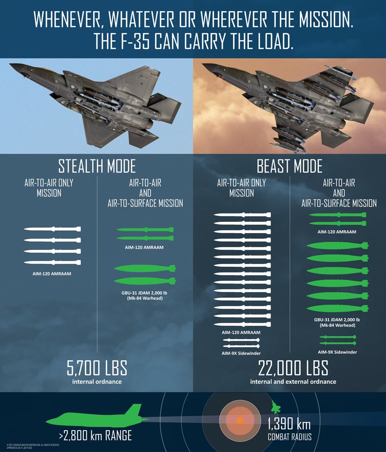 Having a stealthy flight of F-35s call up missiles on demand from non-stealthy “beast mode” configured F-35s operating many miles behind them could be a huge force multiplier and would help overcome the F-35’s wanting internal air-to-air missile carriage capability, which is limited to four missiles at this time. This is tentatively planned to be increased to six missiles at some point in time, but exactly when this would happen, and what it will cost remains unclear. Lockheed’s notional 14 AMRAAM load-out likely includes this modification.