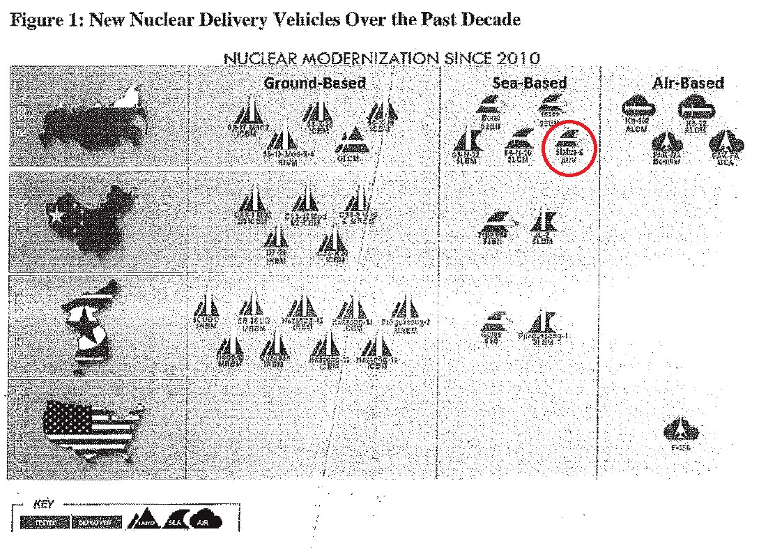 The comparison is completely disingenuous though, since many of the systems, especially the North Korean ones, are likely not anywhere near what the U.S. military would consider a full operational capability. A more fair comparison would show the GBSD, LRSO, and B-21 bomber programs in the United States’ row at least. There are almost certainly other projects in the classified domain, such as the Navy’s aforementioned submarine-launched hypersonic system, which it only revealed to the public in November 2017.