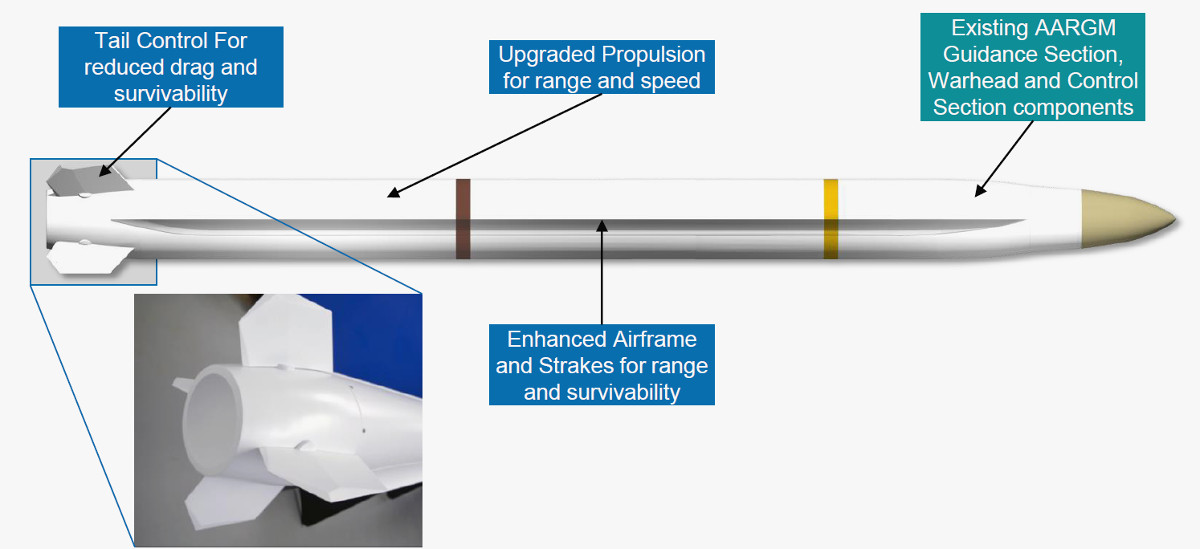 Dispensing with the existing control surfaces and mid-body wings, the AARGM-ER will feature a new tail for flight control and strakes along the side for stability and enhanced range. The streamlined design gives the missile a more aerodynamic profile, hopefully further improving its speed and range.