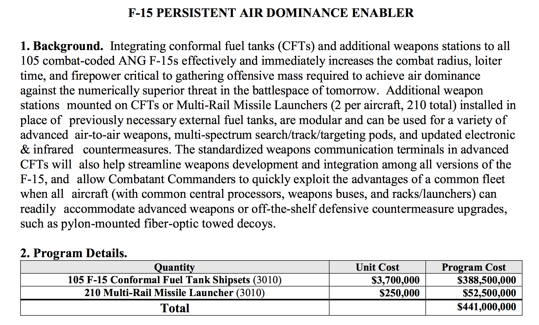 The little-known of program is officially called the F-15 Persistent Air Dominance Enabler. Here’s an excerpt from the Air National Guard’s 2017 priorities document that explains the program and its costs: