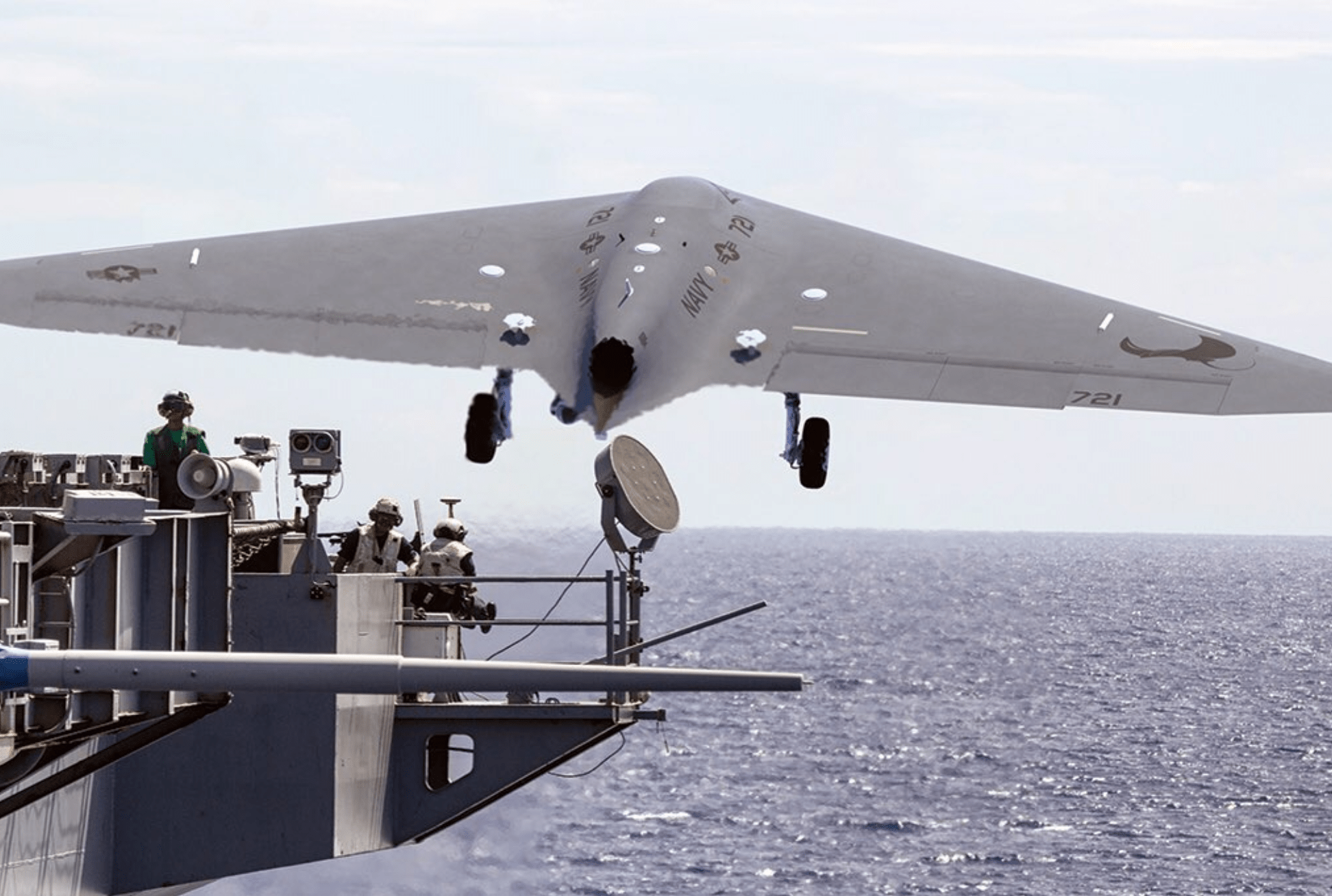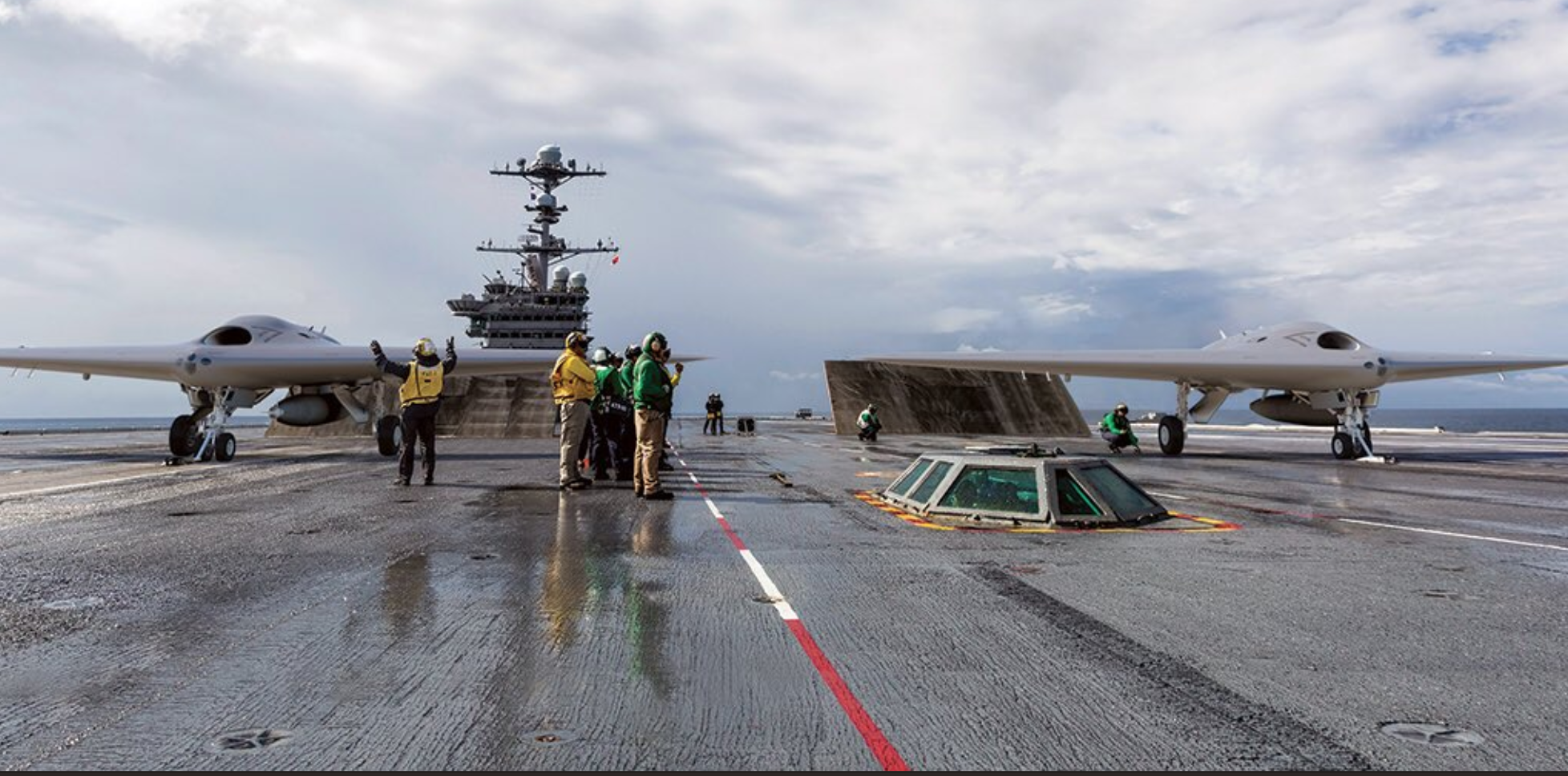 “Weiss says a flying-wing concept was always in the mix, and it kept coming out on top. A flying-wing aircraft has the benefit of being aerodynamically efficient and can carry more fuel for its size. Other benefits include a lower total parts count and reduced spot factor on the carrier deck with the wingtips folded up. Despite the flying-wing design being shorter in length, the landing gear and tail hook have enough separation to safely catch the arresting gear, rather than trip over it.”