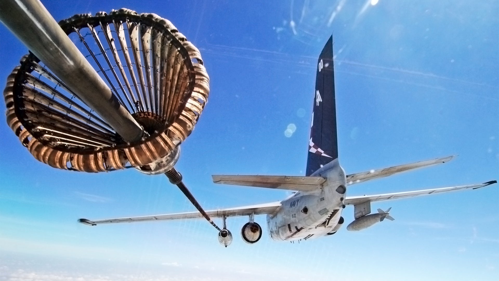 By our calculations, an S-3 burns roughly 1,600lbs an hour at cruise. It would take roughly 1.5 hours to reach its station and the same time on the return trip. That is 4,800lbs of gas. Add in an hour of loiter time and margin for launch and recovery, and that totals around 7,000lbs just as a rough estimate. Add an extra 1,000lbs for good measure. That leaves 22,000lbs of fuel to offer to its ‘customer’ aircraft.