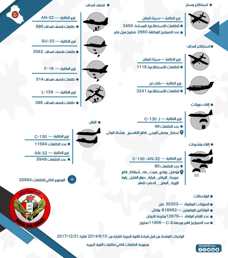 Following a recent strike its F-16IQ Viper multi-role jets flew against ISIS terrorists in neighboring Syria, the Iraqi Air Force has released a detailed infographic showing how many combat and combat support missions each of its aircraft types have flown over the past nearly four years. Of particular note is that the country’s An-32 cargo planes have conducted more airstrikes than either Iraq’s F-16s or its Aero L-159 Advanced Light Combat Aircraft, or ALCA, light attack jets.