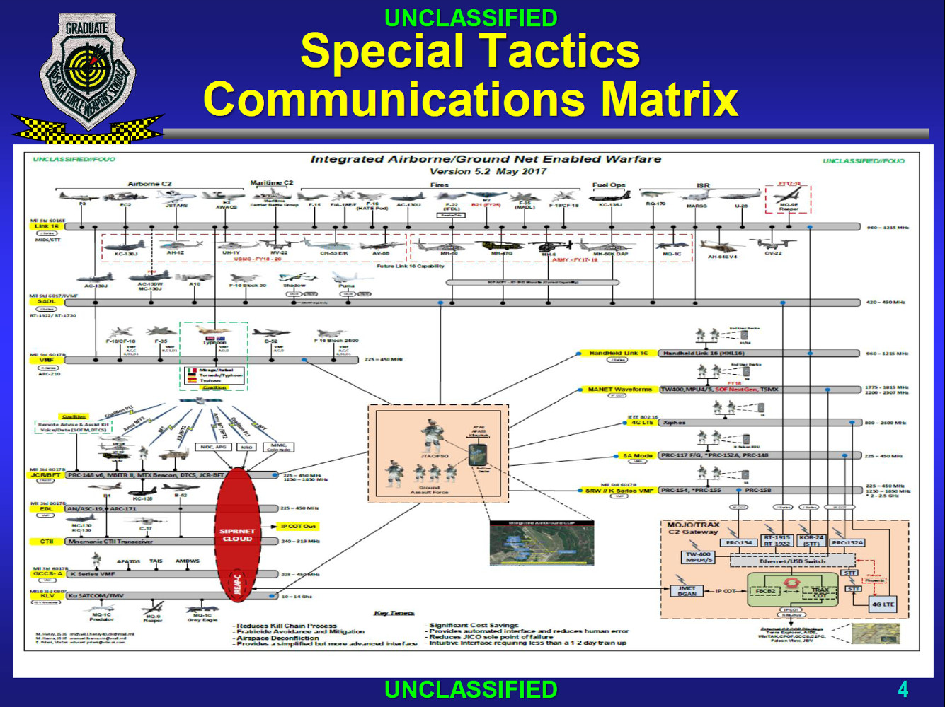 U.S. Air Force Major Michael Smith included the chart, titled “Integrated Airborne/Ground Net Enabled Warfare, Version 5.2” and dated May 2017, in a briefing he presented at the National Defense Industry Association’s Precision Strike Annual Review on March 20, 2018. Smith is the Chief of Weapons and Tactics for the 720th Special Tactics Group, which is part of Air Force Special Operations Command and oversees the bulk of the special tactics airmen assigned to that command.