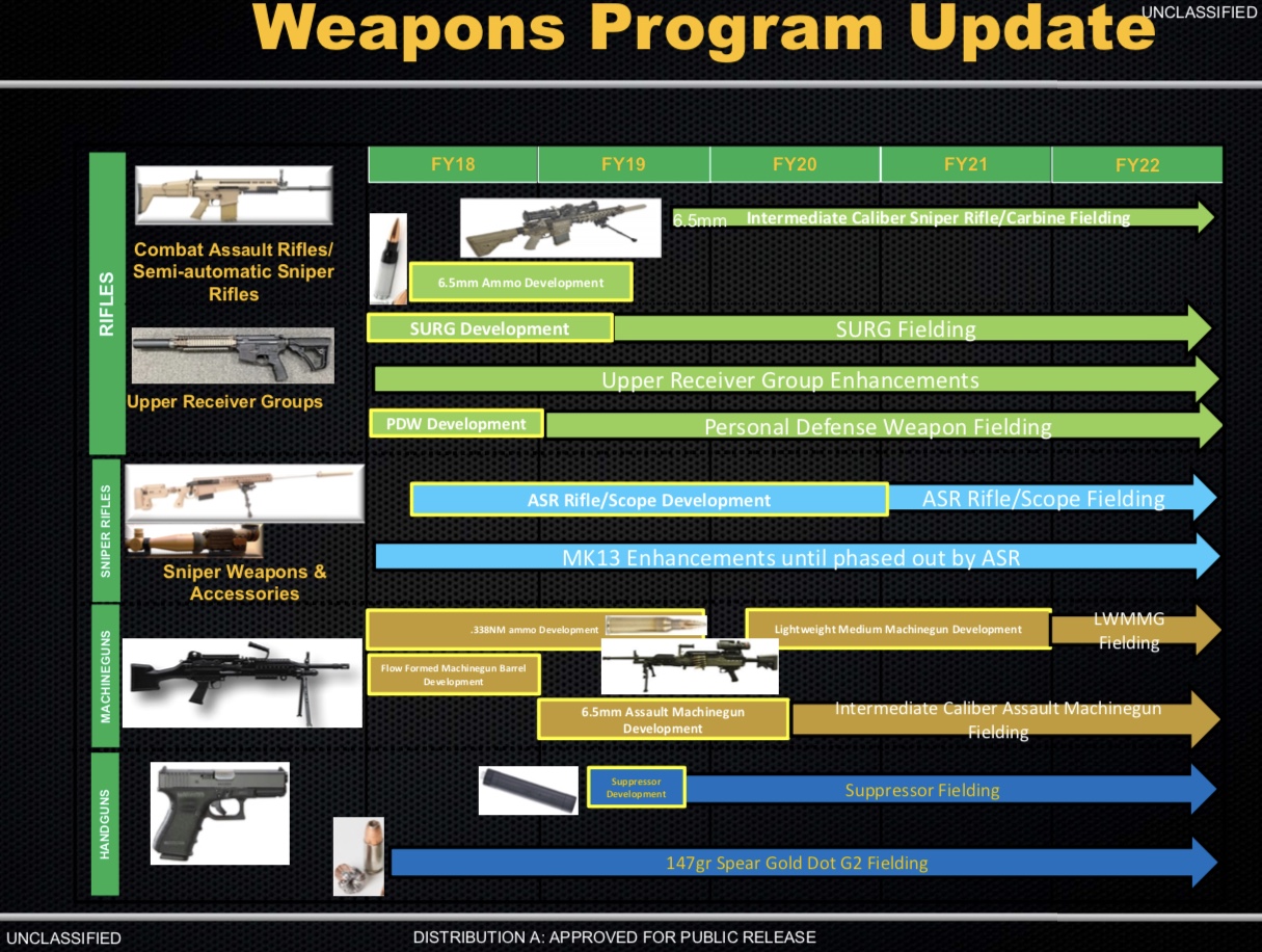 It is not clear whether or not Special Operations Command plans to use the shift in ammunition type as an opportunity to consolidate the total number of applicable weapons in use across its components. Owens’ presentation used the M110A1 CSASS as a standard-in for the future 6.5mm Creedmoor rifles, but there was no indication that this would be the universal platform. Special operators are set to begin receiving the new weapons in 2019.