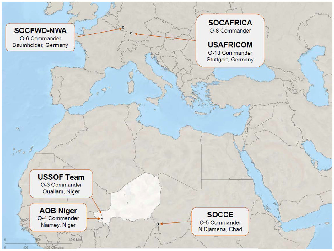 The acting commander of special operations forces in Niger, situated in the country’s capital Niamey, approved this mission, despite knowing its true intention and not having the authority to do so. Yet another special operations headquarters, in neighboring Chad – an element known as a Special Operations Command and control element, or SOCCE – has to approve raids on known terrorists in the region and may end up sending those requests higher up the chain of command to its own superior units, situated in Germany, according the Pentagon’s public summary and the remarks at the briefing.