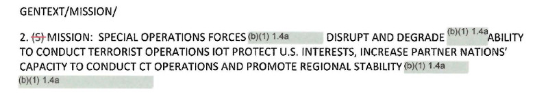 Special Operations Command Africa (SOCAFRICA) is specifically responsible for “operations, exercises, security cooperation and engagements” in support of the broader campaign plan. This list includes “operations” as distinct from “exercises” and “security cooperation,” which makes it clear that from the very beginning that there was the possibility for American personnel to find themselves on active missions, with or without partner forces. It also says that one of special operators’ main objectives in the region is simply to “disrupt and degrade” terrorists and the unredacted portions make no specific mention of having to do so in cooperation with partner forces.