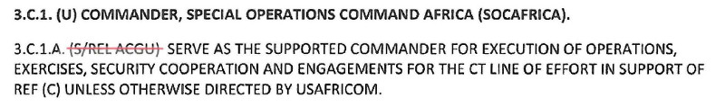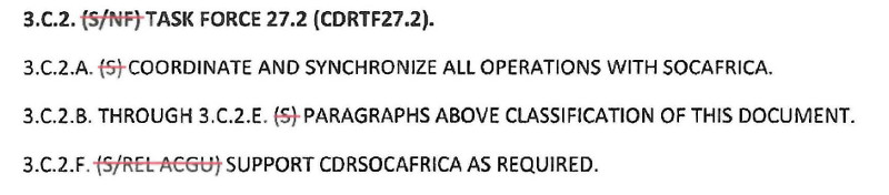 In addition, the order names the previously unreported Task Force 27.2 as being a separate force that needs to “coordinate and synchronize” its activities with SOCAFRICA and support that command “as required.” This unit nomenclature is typically associated with elements of the secretive Joint Special Operations Command (JSOC), who are almost entirely focused on direct action missions and typically take the lead in doing so even when working with local forces.