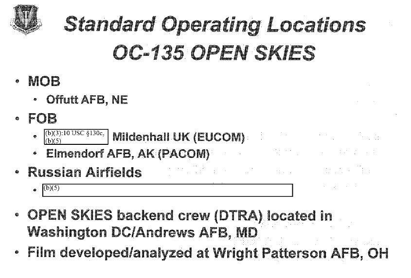 To help enforce the treaty and provide the U.S. government with a capability to exercise its rights under the agreement, the U.S. Air Force’s 55th Wing at Offutt Air Force Base in Nebraska operates two specially configured OC-135B aircraft. The Defense Threat Reduction Agency, a U.S. government agency charged with both monitoring developments regarding weapons of mass destruction and also working to reduce the threat of conventional conflict, provides a portion of the crew during the actual mission.