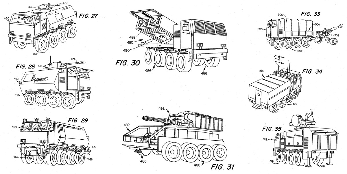 The same organization subsequently experimented with various light tank and assault gun concepts, Humvees carrying Hellfire missiles, and other state-of-the-art, but highly mobile systems. Likely with this type of organization in mind, Standard Manufacturing’s patent outlines an entire family of vehicles based on its 8×8 suspension, including cargo trucks, armored personnel carriers, scout vehicles, mobile artillery rocket launchers, and platforms for communications nodes and electronic warfare systems.