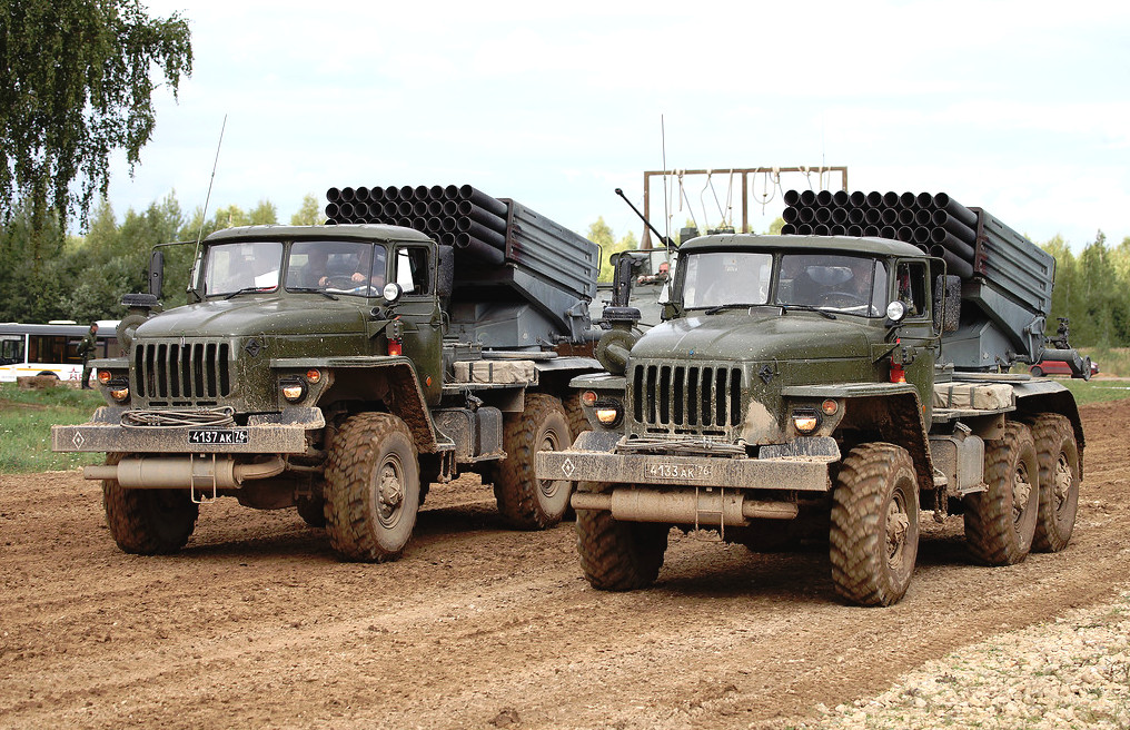There are various launchers in service with various countries mounted on wheeled and tracked chassis, as well as improvised and production man-portable systems. One of the most common configurations is a 40-round launcher on the back of a 6×6 truck, typically referred to by the Russian nomenclature BM-21. By far the most extreme variation on the concept is a semi-trailer-mounted system from the UAE with 240 tubes arranged in four individual arrays of 60 tubes each.