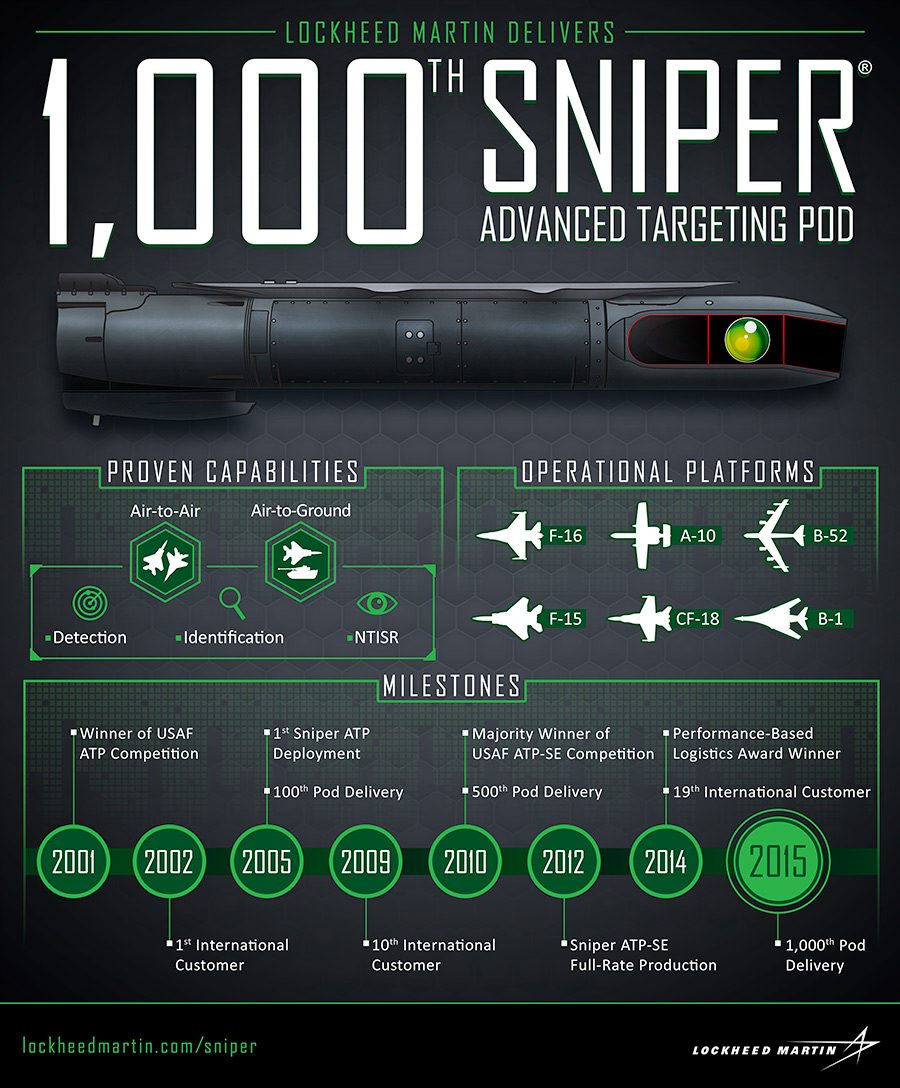 Designed primarily for strike fighters to surveil and target objects on the ground, the Sniper pod has since migrated to the B-1 and B-52 bomber communities with great success and is largely seen as the standard for targeting pods the world over.