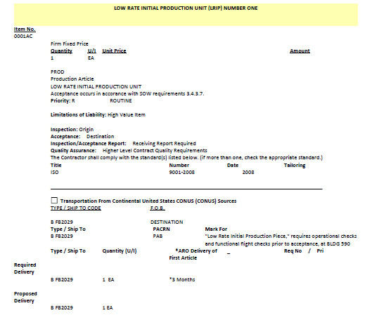 But most shockingly, the notice specifically says that actual deliveries would only start four years after the last of the first five ordering periods. The contractor responsible for the program would only have to deliver the first four low rate initial production kits by 2029. [Correction: This is incorrect. The earliest date at which the wing kits would arrive is some time in 2022]