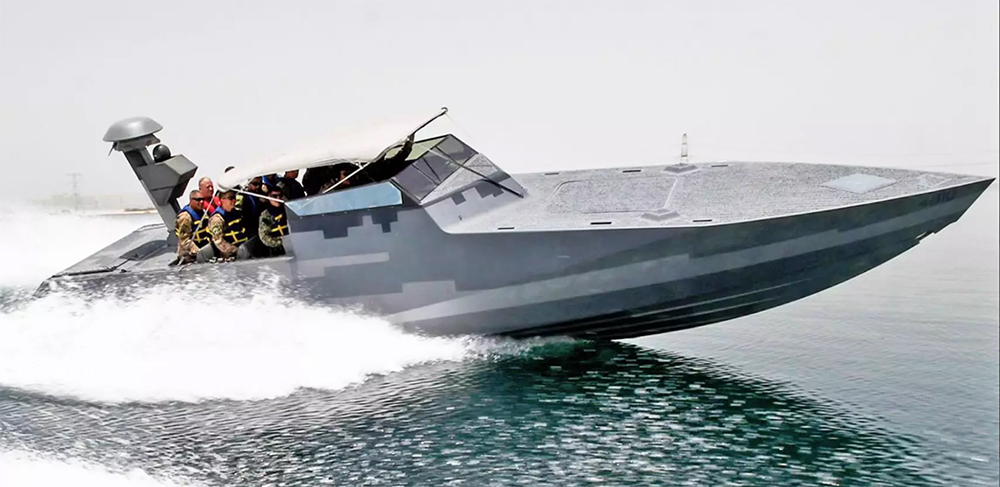 We have wondered what types of craft would fill the now ironically named M/V Ocean Trader’s four launch and recovery bays located on the ship’s starboard side. The most likely option seemed to be rigid-hull inflatable boats, like the 11 meter Naval Special Warfare RHIB. But it turns out the ship totes around far more advanced vessels in the form of the stealthy Combat Craft-Assault (CCA).