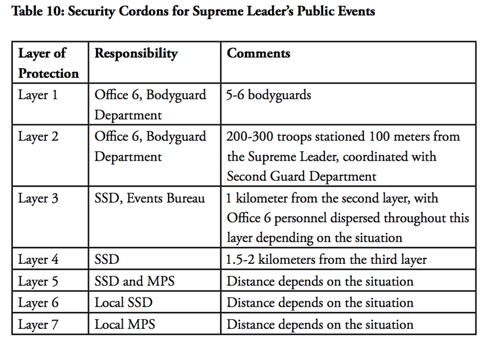 Office 6, which reports directly to Kim Jong-un’s Personal Secretariat through the GC, takes the lead in all of Kim Jong-un’s public appearances. It is responsible for the protection of the Supreme Leader at the closest range. As such, it provides security inside the first two layers of security in a seven-layer cordon every time the Supreme Leader travels outside of his Party headquarters or one of his residences.