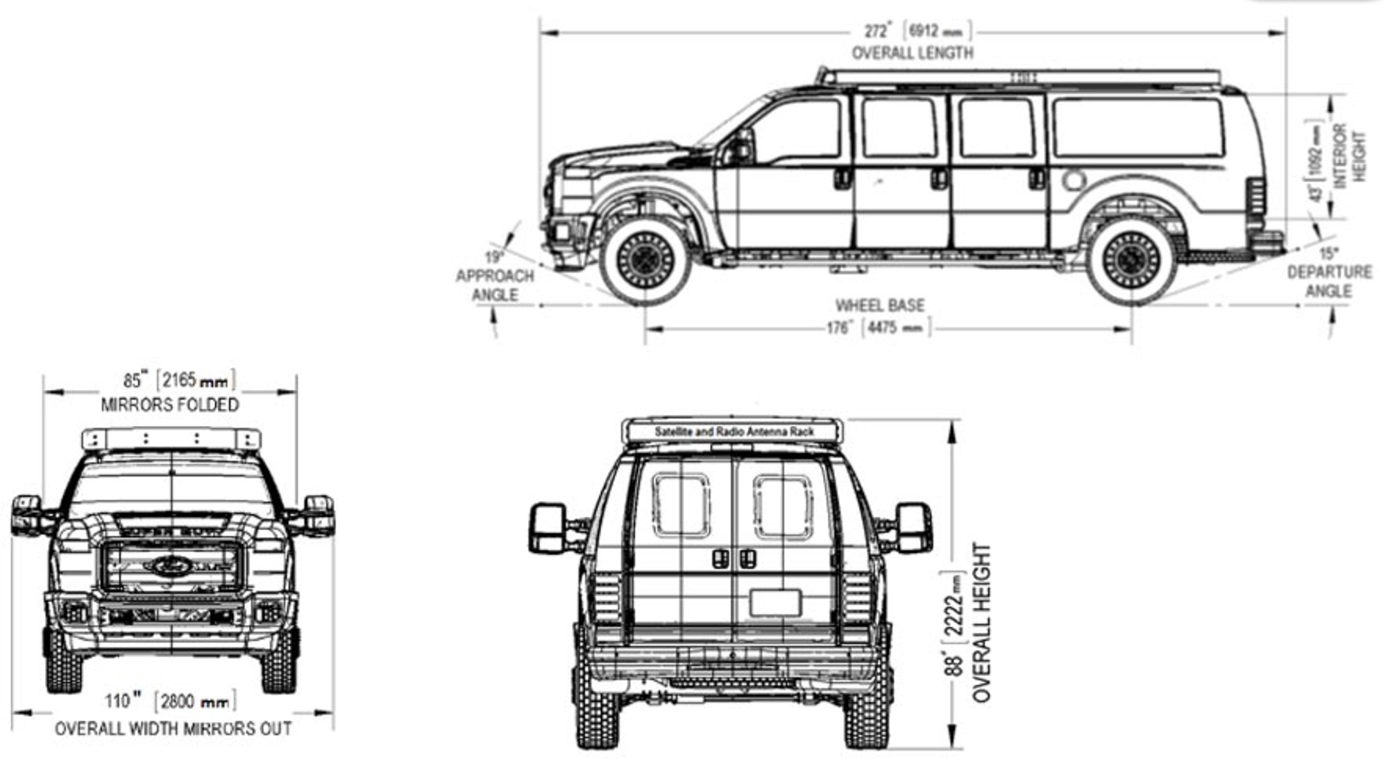 “The Mobile Communications Vehicle (MCV) is built on a Ford Super Duty truck platform modified to maximize payload with an overall appearance of a six door sport utility vehicle with air ride suspension. The MCV includes a structurally reinforced 5 slice antenna platform that incorporates an omni-directional satellite mount.