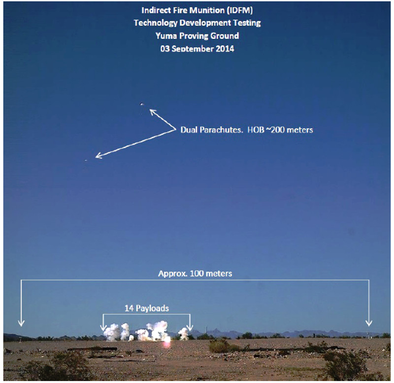 When the round hits an altitude of around 650 feet, it breaks in half, with parachutes pulling it apart at both ends. The flash-bangs, each with a streamer tail to slow their descent, then fall onto the target area. Engineers added delay fuzes in each one of the submunitions to do their best to makes sure they hit the ground before going off for maximum effect. A single round can effectively cover an area of more than 4,000 square feet, according to the Army.