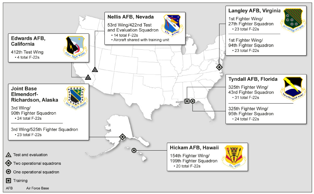 GAO found, not surprisingly, that operational units at Langley Air Force Base in Virginia and Joint Base Elmendorf-Richardson in Alaska, both of which have two squadrons of Raptors apiece, had higher availability rates than the single squadrons at Tyndall Air Force Base in Florida and Hickam Air Force Base in Hawaii.