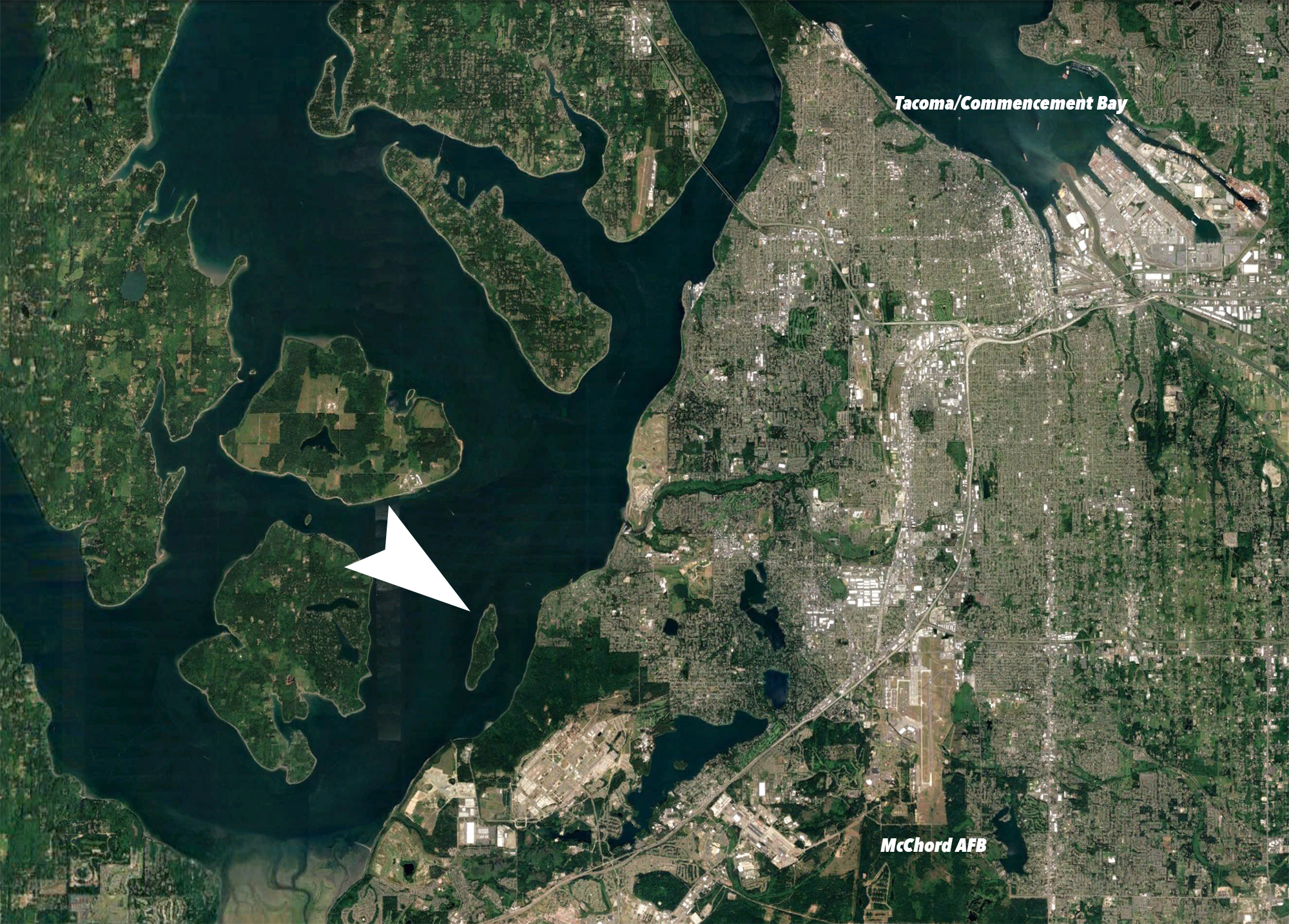 The crash site (white arrow) and the surrounding area. You can see just how close McChord AFB was.