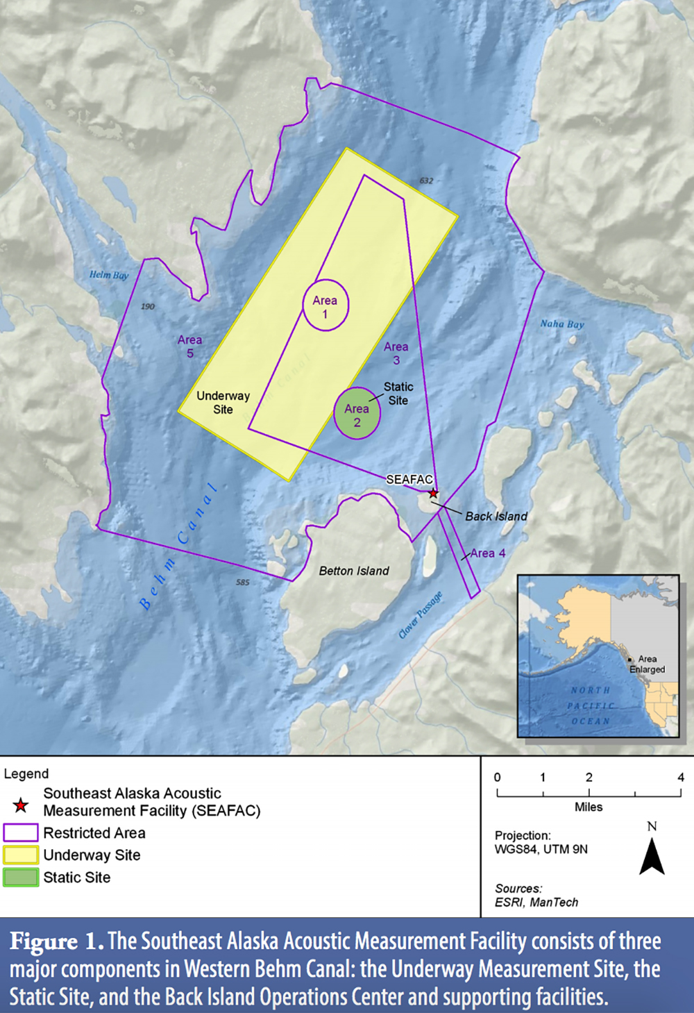 Behm Canal is an ideal setting for an underwater acoustic test range because it is shielded from the ocean and from large amounts of vessel traffic, and thus from ambient noise. Its basin is also ideal, with a smooth tub-like contour that provides as close to lab-like acoustic conditions as possible. It can also be cordoned off relatively easily when tests are underway.