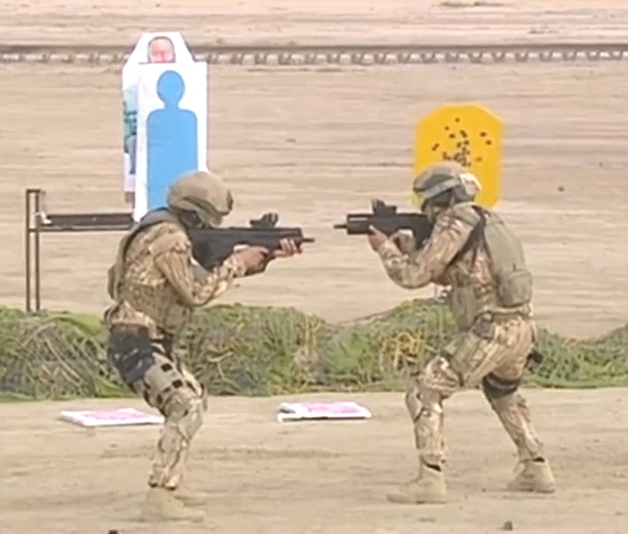 Afterward, Berdimuhamedov observes troops and paramilitary police perform a variety of firearms and hand-to-hand combat drills. At one point, a pair of individuals appear to engage in a dangerous “confidence drill,” facing each other at very close range and shooting 9mm Tavor submachineguns over each other’s shoulders.
