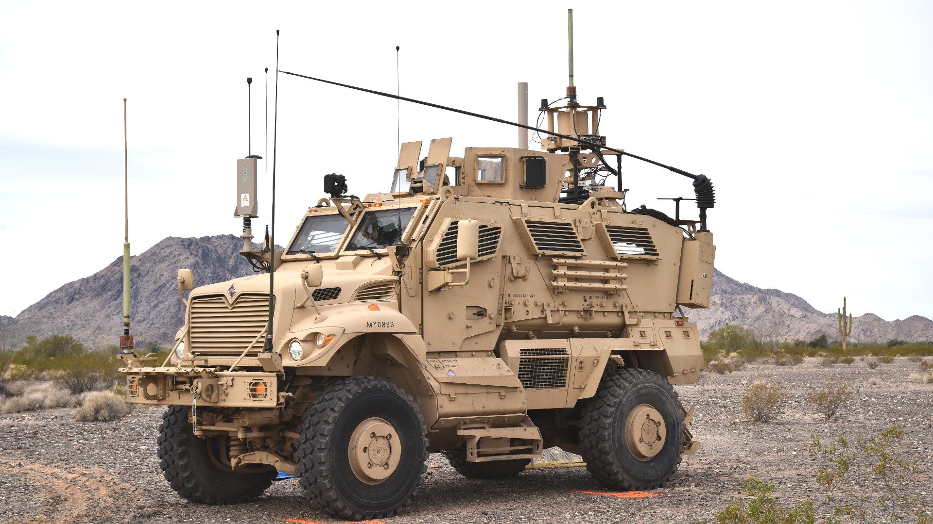 The vehicle also features various antennas on an extendable mast that would help expand the coverage area of the vehicles. Line-of-sight communication systems often have trouble transmitting across complex terrain, such as hills and mountains, and from within constrained urban areas. Jammers, which flood those emitters with electronic “noise,” have the same limitations.