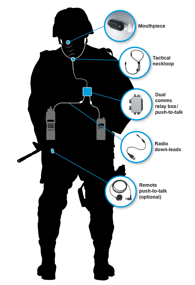 A second wireless or wired connection then transmits the information to and from the radio or radios, which work as they would if they were connected to any other combination of microphone and speaker. There are also no external components on the head that can get damaged or knocked off.