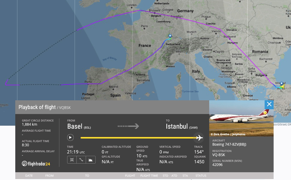 Flightradar24.com has some puzzling information regarding its activity. Below you can see it was going about its normal business until those operations ceased around the 15th of March. Then it appears in Tunisia on April 22nd, flying from there to Moscow. Then over the next five months, there are a string of flights without data originating in Moscow and Vladivostok, before the strange September 11th flight from Basel to Istanbul.