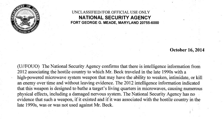 In 2014, the National Security Agency (NSA) confirmed that it had “intelligence information” regarding a “a high-powered microwave system weapon that may have the ability to weaken, intimidate, or kill an enemy over time and without leaving evidence,” according to a statement that Washington lawyer Mark Zaid, who routinely works with clients on cases dealing with classified material, obtained and subsequently released to The Times. “The 2012 intelligence information indicated that this weapon is designed to bathe a target’s living quarters in microwaves, causing numerous physical effects, including a damaged nervous system.”