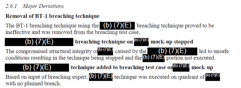 Not unreasonably, censors redacted all information on the methods themselves, citing an exemption for law enforcement-related information. We do know that the testers were able to employ nearly 60 different tools and other pieces of equipment across the eight breaching experiments, but it’s not clear if they tried every tactic against all eight mock-ups. We also know that the first breaching technique, or BT-1, proved to be so ineffective that CBP removed it from the test points entirely.