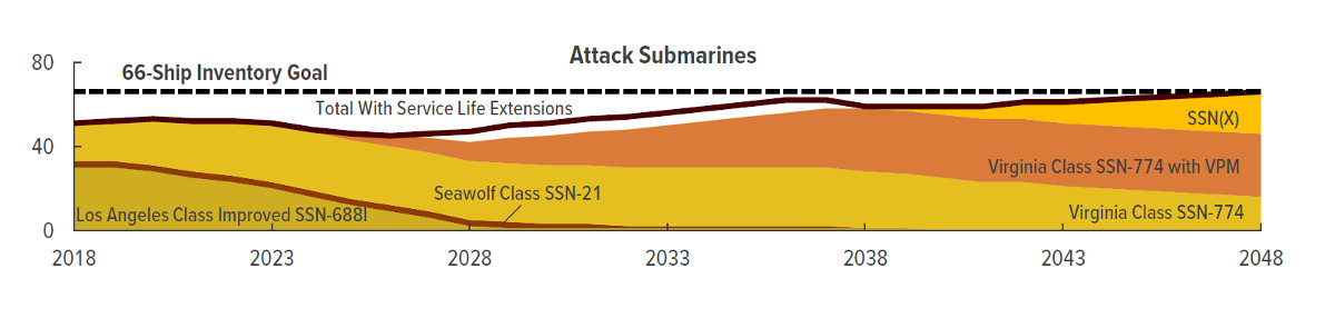 USNI News was one of the first to spot that the Congressional Budget Office explored the Navy’s shifting priorities in its analysis of the service’s latest shipbuilding plan for the 2019 through 2048 Fiscal Years, which it released on Oct. 18, 2018. Purchases of the Virginia-class attack submarine are supposed to end in 2033, after which the Navy expects to begin buying new boats to succeed that design at a rate of two every year through 2048. This would result in a fleet of 30 of the new subs, presently referred to simply as SSN(X).