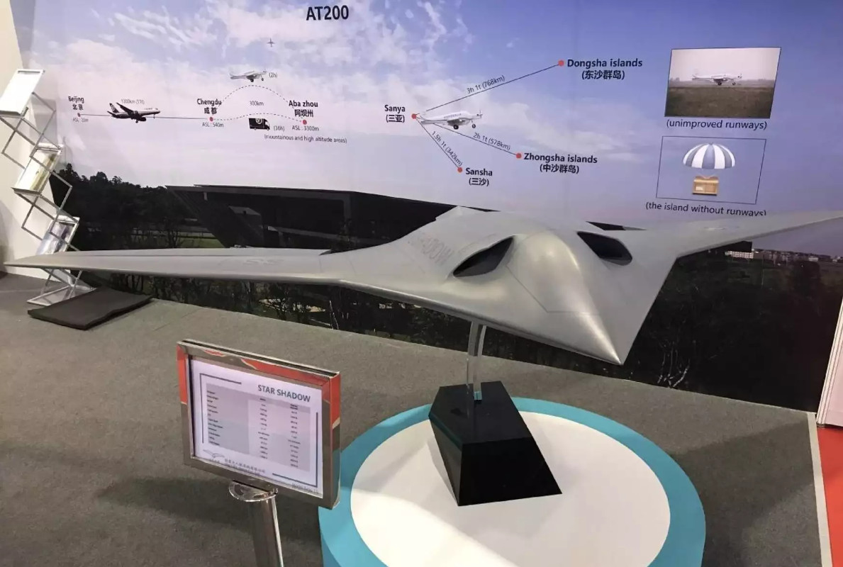 The general size and configuration appear very similar to Star Systems’ Star Shadow. This company showed off a model of this design publicly at the Singapore Airshow in February 2018. It appeared to be a rework of its earlier SG-1 Star Glory drone, a design that featured a 50-foot wingspan and dates back a number of years. At that same event, CASC revealed a model of its own CH-805 stealth flying wing drone concept, but this has a different planform.