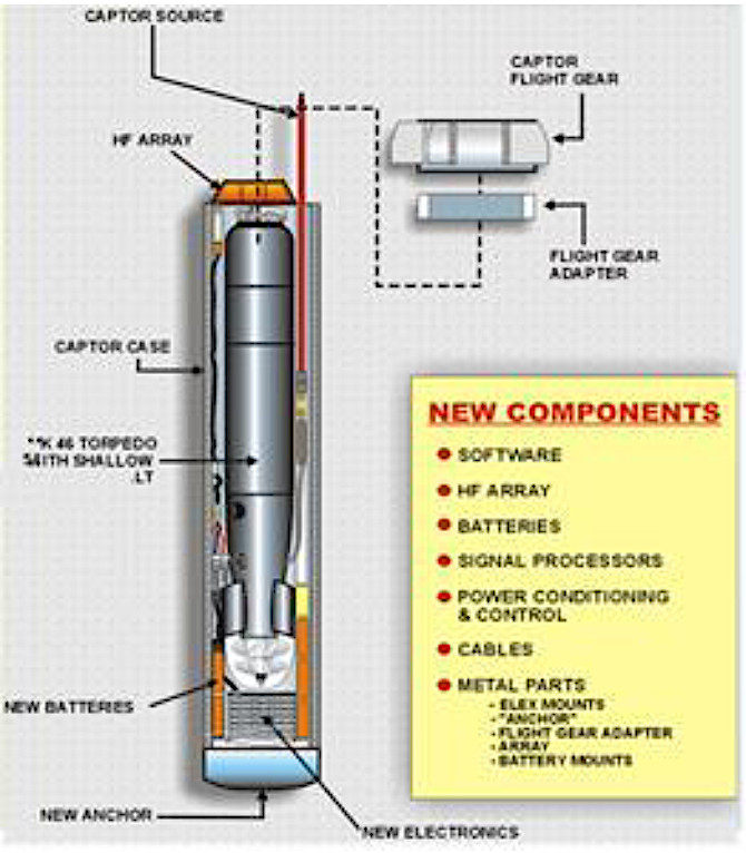 The Navy’s Hammerhead program plans to leverage the older CAPTOR’s basic casing and air-drop components, such as the lugs to attach it to an aircraft. However, the new weapons will have improved targeting sensors, electronics, and software, along with better batteries to power the upgraded systems.