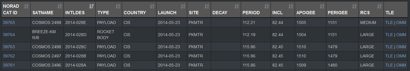 On May 23, 2014, another Rokot/Briz-KM launch vehicle put three Rodnik communications satellites into orbit. Again, the U.S. military tracked five objects, with Object E, in that case, turning out to be an inspector satellite known as Kosmos-2499. The perigees and other data for the five objects are extremely similar in both cases.