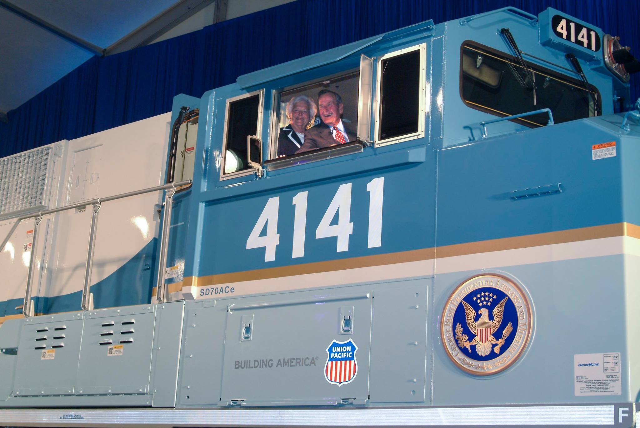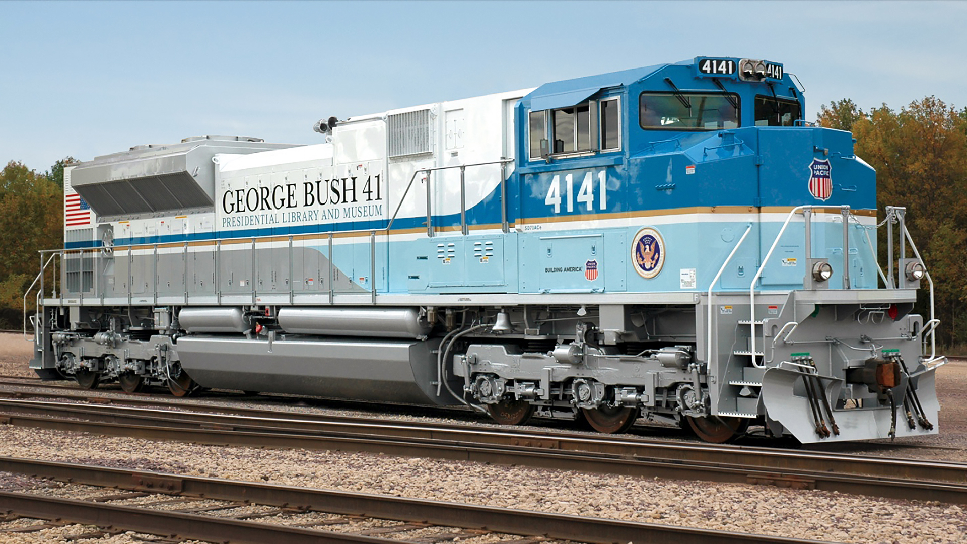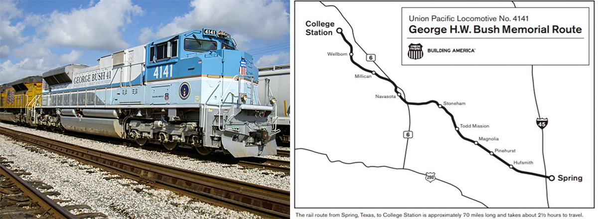 The origin of locomotive 4141 dates back to 2005 when Union Pacific decided to dedicate a specially painted locomotive to George H.W. Bush. Its motif was designed to resemble Air Force One and emblazoned with ‘President Bush 41’ and ‘Presidential Library and Museum’ along its sides.