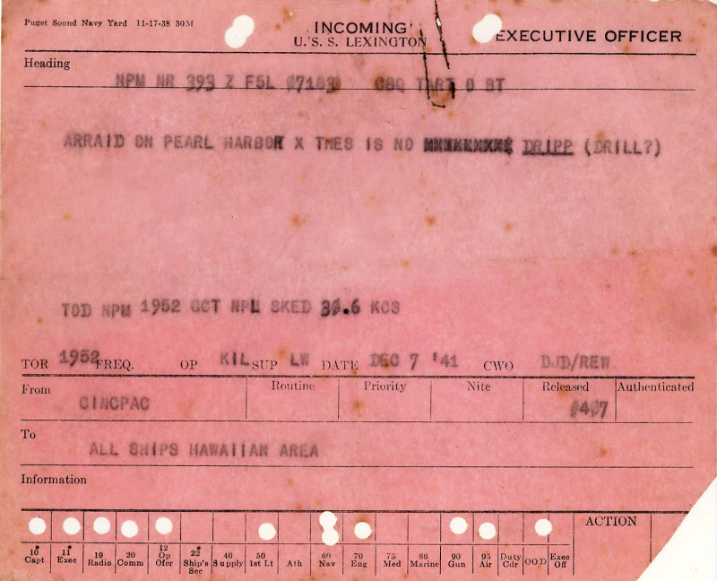 Often times, there is confusion about the first communique from the attack on Pearl Harbor as it appears on multiple letterheads and in various formats, but that is because those documents are receipts of the message that was transmitted to many locales and ships. For instance, the carrier USS Lexington (CV-2) was on her way to Midway to deliver Marine fighter aircraft when the message came through. The ship’s Executive Officer Wallace “Gotch” Dillon was first to see it come through the teletype machine. This is that version of the message: