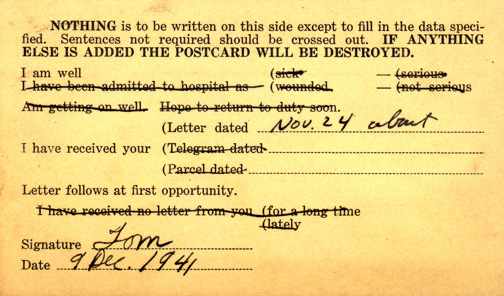 Other messages that emanated throughout the day from Oahu were many in number and highly inaccurate due to the fog of war and the very real sense that an invasion of the islands was imminent. In the days after the attack, with security now at its highest state on the smoldering paradise-like island, personnel trying just to get word home that they survived the raid became an exercise in extreme message control and brevity. This is an example of the postcards that servicemembers were allowed to send home to let loved ones know that they had survived the attack: