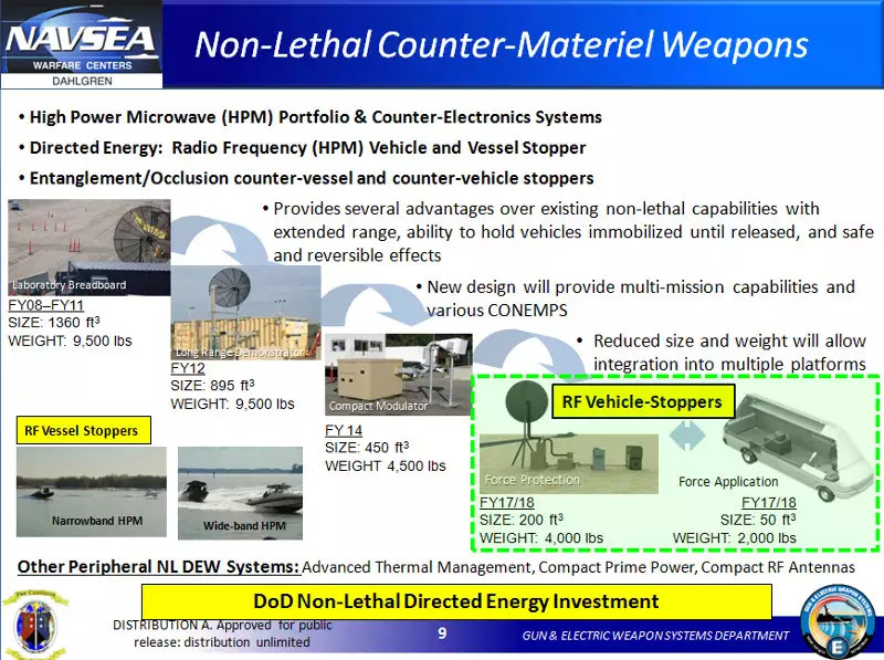 Lasers physically destroy their targets, burning holes in them, while high-power microwaves might simply disrupt the drone’s ability to communicate with its operator. A burst of high-power microwave energy would also be enough to fry the electronics inside the unmanned aircraft, depending on how powerful the directed energy beam is and how far away the target is from the weapon.