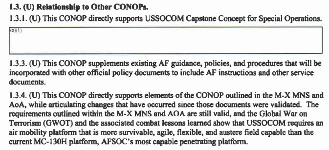 A number of general Air Force and U.S. Special Operations Command (SOCOM) requirements informed the Project IX CONOP. The document also specifically makes reference to the aircraft outlined under the early 2000s’ M-X program and Air Force censors redacted another related CONOP in its entirety. It’s worth noting that the author’s inquiries to various public affairs offices and subsequent FOIA requests have yet to turn up evidence of any projects numbered one through eight.