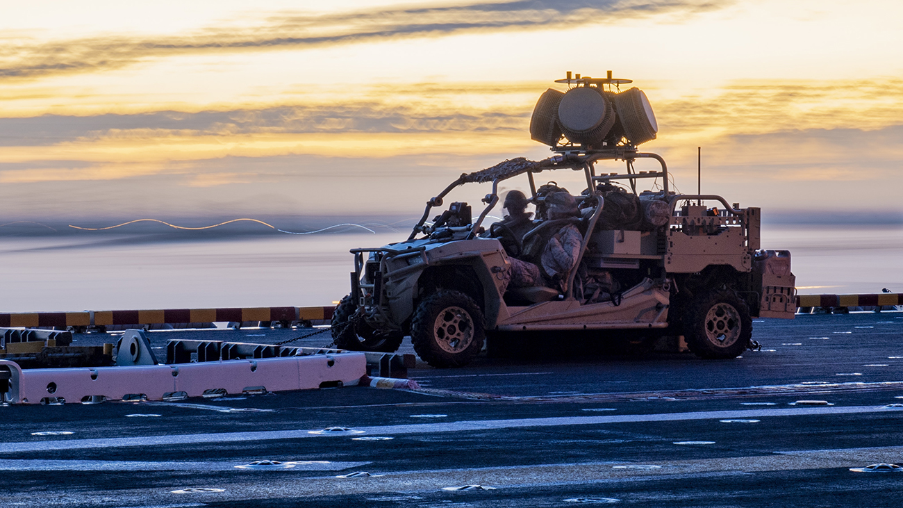 Sitting atop the radar system is gyro-stabilized CM202 multi-sensor optical ball. This is used to positively identify aerial targets day or night so that a far better-informed decision can be made as to whether or not a suspicious target is indeed a threat. An up-front control tablet is installed in front of the passenger seat of the MRZR. This provides sensor data and control of the system, including the CM202.