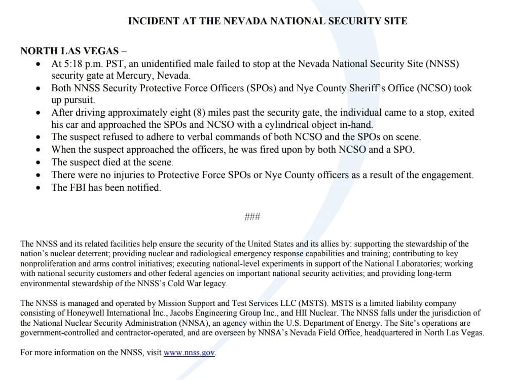 At 5:18pm local time, a man drove through the security checkpoint at Mercury, which is located roughly 70 miles north of Las Vegas. The austere enclave off U.S. Route 95 has long acted the basecamp for the Test Site’s operations. A car chase ensued, with the notoriously territorial private contractors that guard the massive installation and Nye County Sheriff deputies pursuing the rogue vehicle.