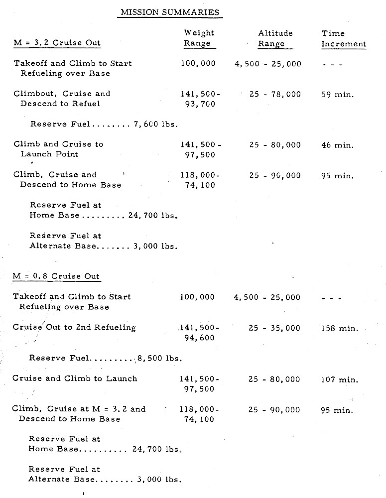 In both cases, the assumption is that the plane would fly from a base inland in the Contiguous United States more than 2,340 miles to a position east of Hawaii. The two mission profiles also required the mothership to refuel in flight near the base after takeoff to fill its tanks to close to 100 percent capacity, before setting out into the Pacific, where it would refuel again.