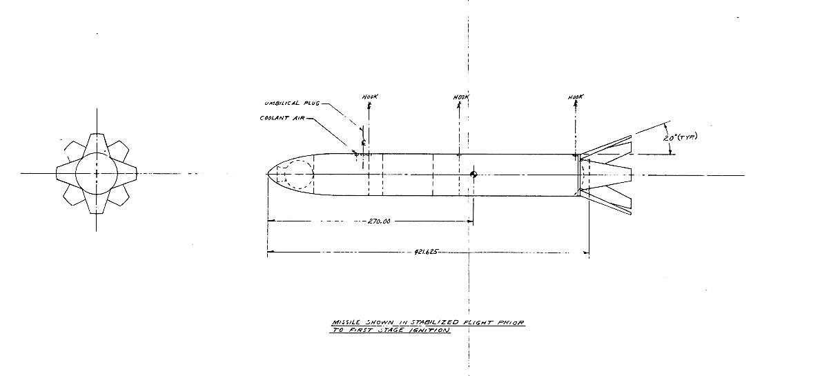 This second document explained that the original requirements for this aerial space launch concept called for a satellite and booster that would be smaller than Polaris. As such, the first configuration was less than 360 inches long and only 40 inches wide. These dimensional stipulations subsequently got relaxed for unspecified reasons to allow the use of a modified version of the SLBM, according to the report.
