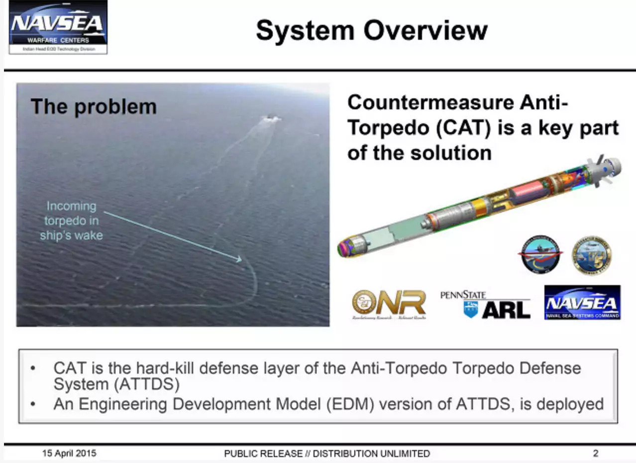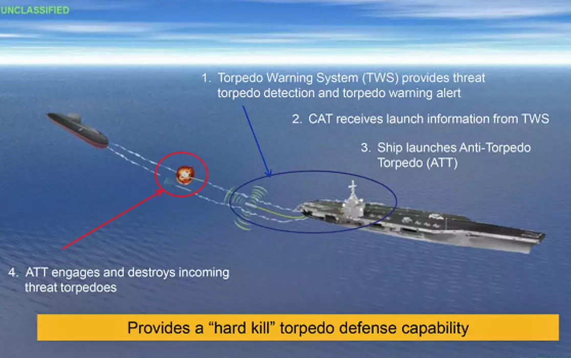 The TWS includes a towed acoustic sensor that trails behind the ship to detect potential threats, classify them, and provide targeting information for the CAT. The CAT is a torpedo-like “hard-kill” interceptor that homes in on the torpedo and destroys it either by physically smashing into it or with its own explosive warhead. You can read more about the system and how the Navy expected it to work here.
