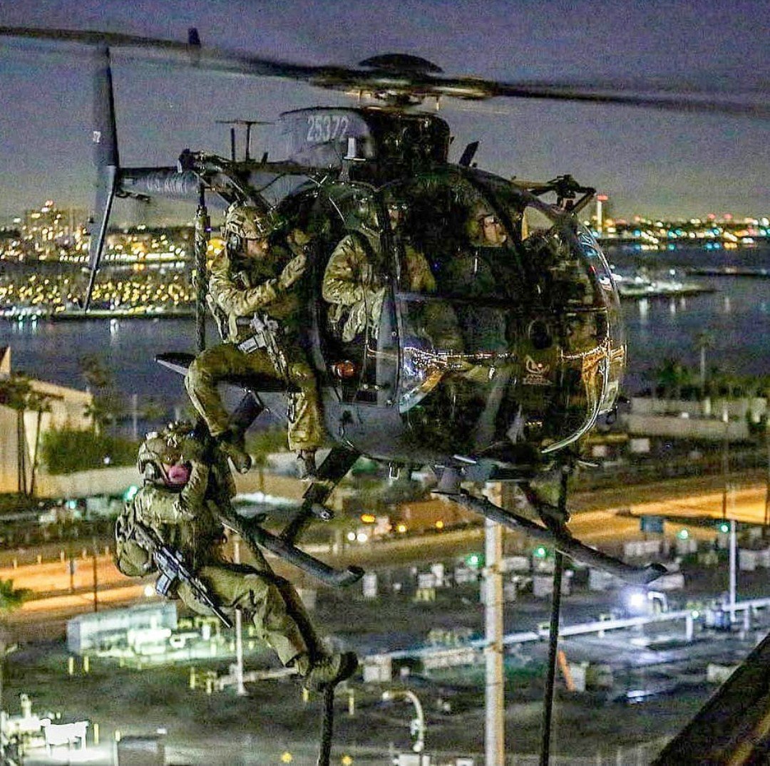 The Night Stalkers have been executing a high profile exercise in the Los Angeles area since Monday evening when the tell-tale signs of their arrival mysteriously began to materialize on plane tracking software. Since then we have reported on Little Birds buzzing down the streets of Downtown Los Angeles at treetop level and MH-6s and MH-60s making incredible formation landings on various roads and structures around big landmarks, like the Staples Center. You can read all about why the 160th does this type of training and where they tend to do it in this past piece of ours. But last night the action clearly moved to Long Beach as plane trackers showed the various fixed-wing surveillance assets, namely a P-8 Poseidon and a pair of U-28s—set up large circular orbits over the harbor there. This incredible photo offers a far more intimate view of what the shadowy unit and their special operator ‘customers’ were up to while there.