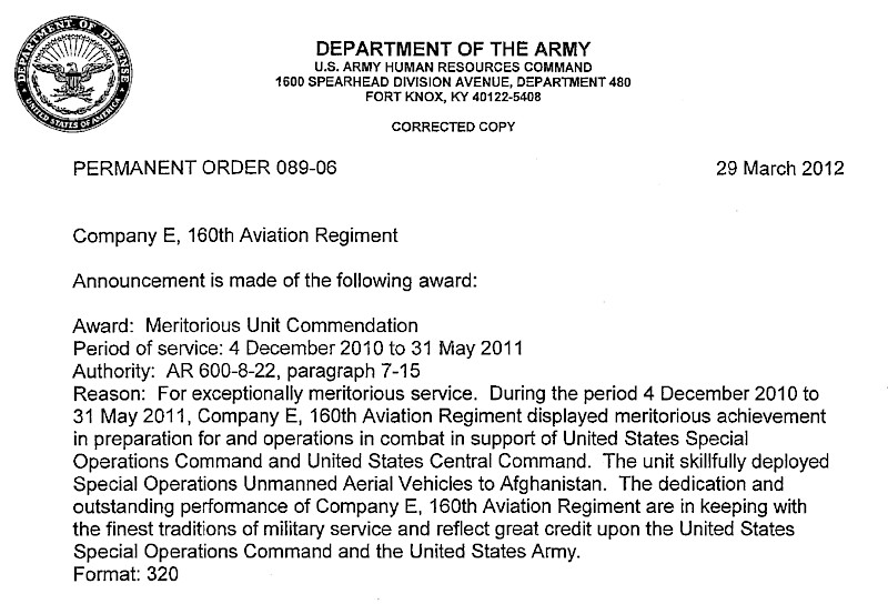 This is the first new unit USASOC has created under the control of the 160th since it activated Company E in October 2010. The Army had shuttered the previous incarnations of both Companies E and F, which were both equipped with MH-47 Chinooks at the time, in 2007. The personnel and helicopters from these units subsequently became part of the new 4th Battalion, 160th Special Operations Aviation Regiment.