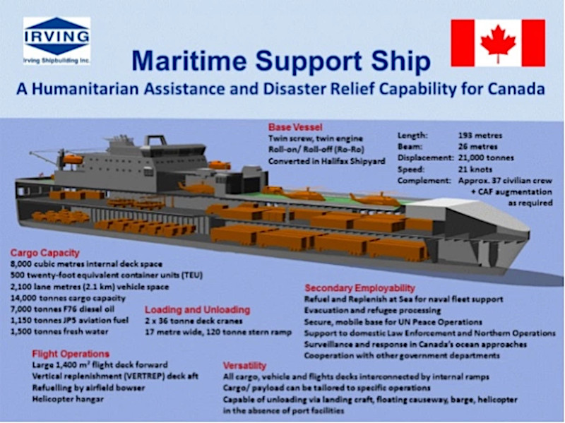 In 2016, Canada’s Irving Shipbuilding pitched another conversion of a roll-on/roll-off ship similar to Flensburger’s designs, known as the Maritime Support Ship, which was primarily geared toward humanitarian aid and disaster relief missions. The general proposed configuration is also similar to the one BAE delivered to the Navy. Irving said the total cost to the Canadian government would be less than $250 million per ship, making the concept especially attractive as a low-cost option for lower-risk missions.