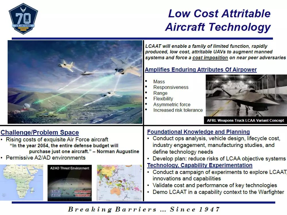 LCASD aims to be able to eventually field a optionally reusable, highly adaptable, low-end unmanned combat air vehicle for $3 million apiece for batches of up to 99 aircraft per year, or $2 million each for yearly orders of 100 or more. In essence, the LCASD concept is “high-volume” both in the strategy behind it and in terms of procuring it affordably.