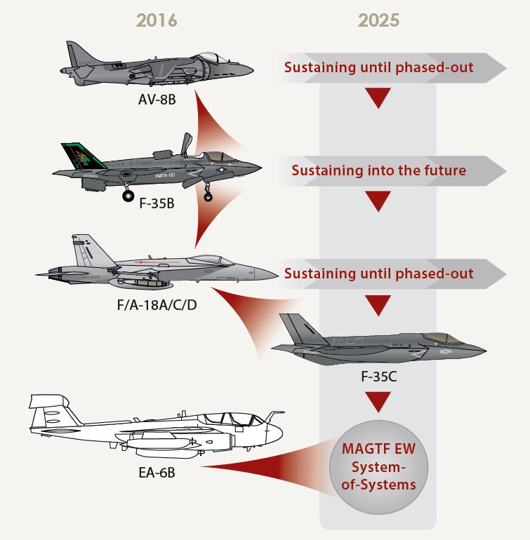 “The Marine Corps’ comprehensive plan to address electronic warfare (EW) requirements after the EA-6B Prowler sundown in fiscal year 2019 is Marine Air Ground Task Force (MAGTF) EW, which uses modern technologies and integrates multiple aviation platforms (unmanned, fixed-wing and rotary-wing assets), payloads, ground-based EW nodes, and cyber effects to provide commanders with an organic and persistent EW capability. The MAGTF EW concept transitions the Marine Corps from focusing on low-density/high-demand EW to a distributed, networked, platform-agnostic approach. MAGTF EW will complement joint EW assets in support of ground forces and fifth-generation aircraft flying against sophisticated integrated air defense systems.”