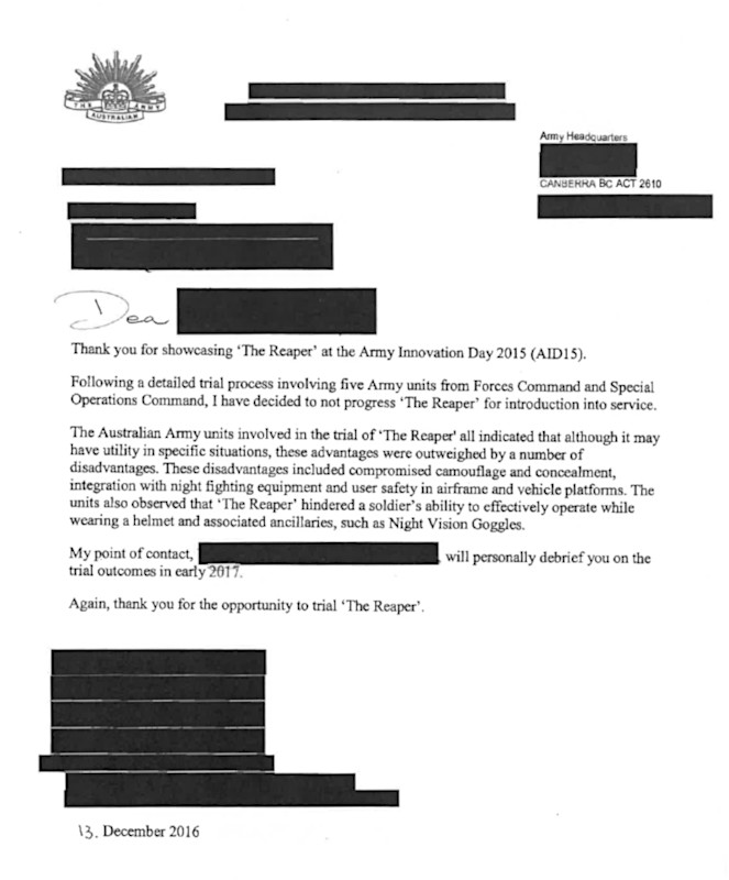“The Australian Army units involved in the trial of ‘The Reaper’ all indicated that although it may have utility in specific situations, these advantages were outweighed by a number of disadvantages,” an unknown officer wrote in a letter to Advanced Accuracy Solutions. “These disadvantages included compromised camouflage and concealment, integration with night fighting equipment and user safety in airframe and vehicle platforms.”